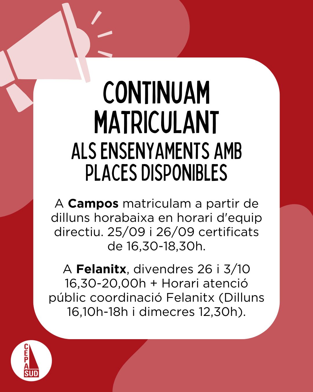 El CEPA SUD compta amb una orientadora que vos ajudarà a resoldre dubtes sobre hàbits i tècniques d’estudi, planificació del temps, orientació acadèmica i sortides professionals. Per contactar amb ella, podeu demanar cita prèvia.