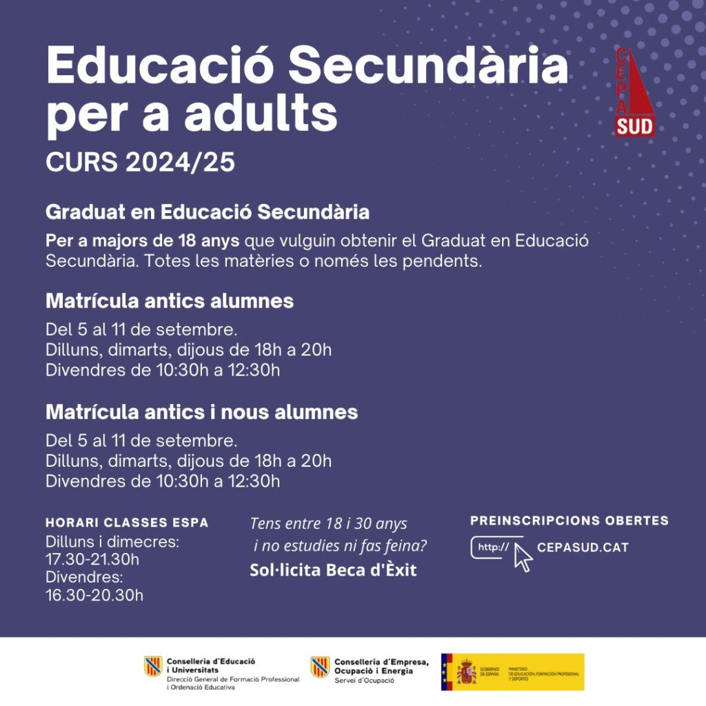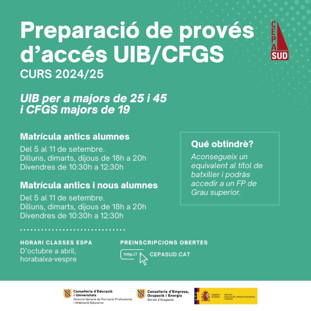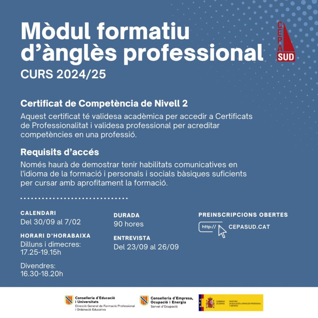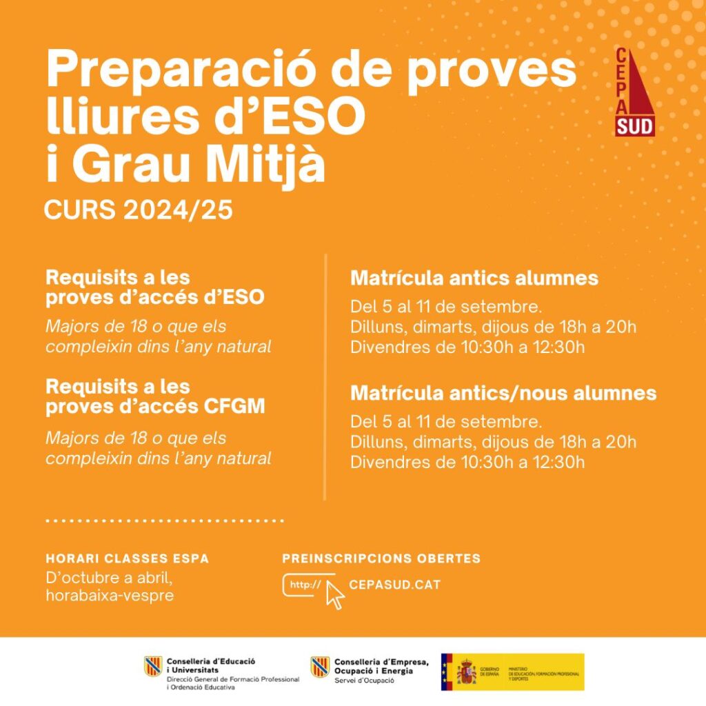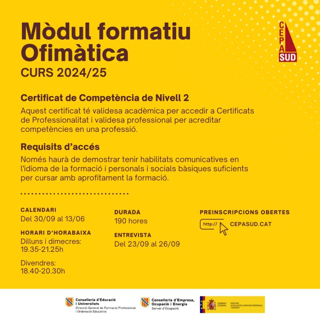 💻📝⏳ ATENCIÓ NOVA OFERTA FORMATIVA!!! Preinscripcions tancades, vine al centre en horari de matrícula i matricula’t!!!! juliol 25, 2024 Contingut General