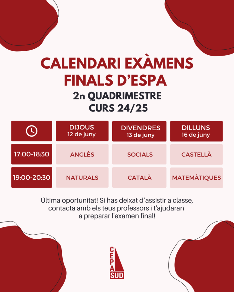 📚 Ja pots consultar el calendari d’exàmens del 2n quadrimestre de l’ESPA!