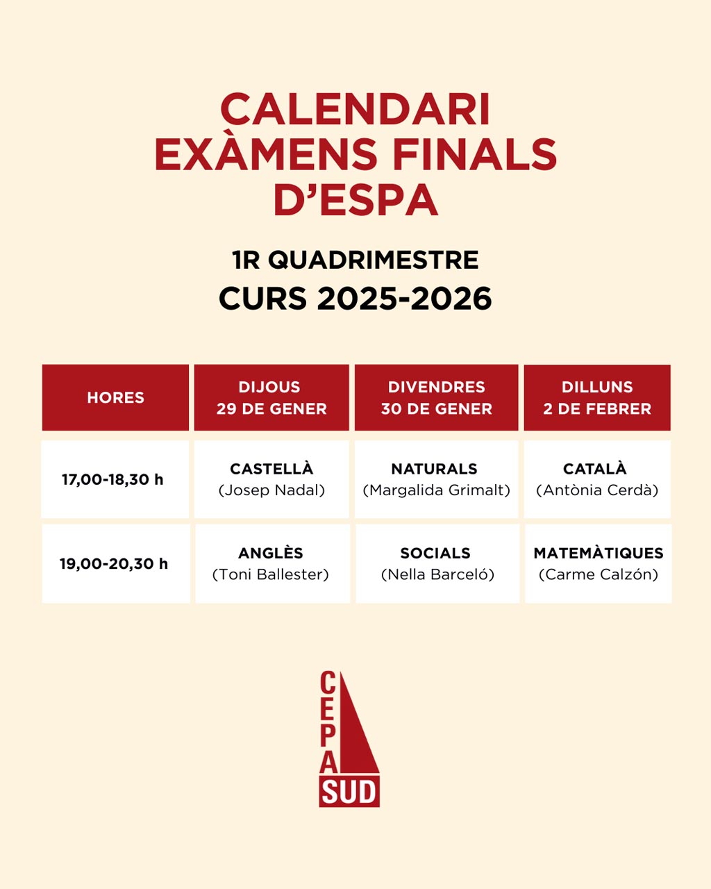 Calendari oficial 📅 Aquí tens les dates i hores dels teus exàmens finals. ✅ Planifica’t, repassa i vine amb tot el material necessari. L’esforç valdrà