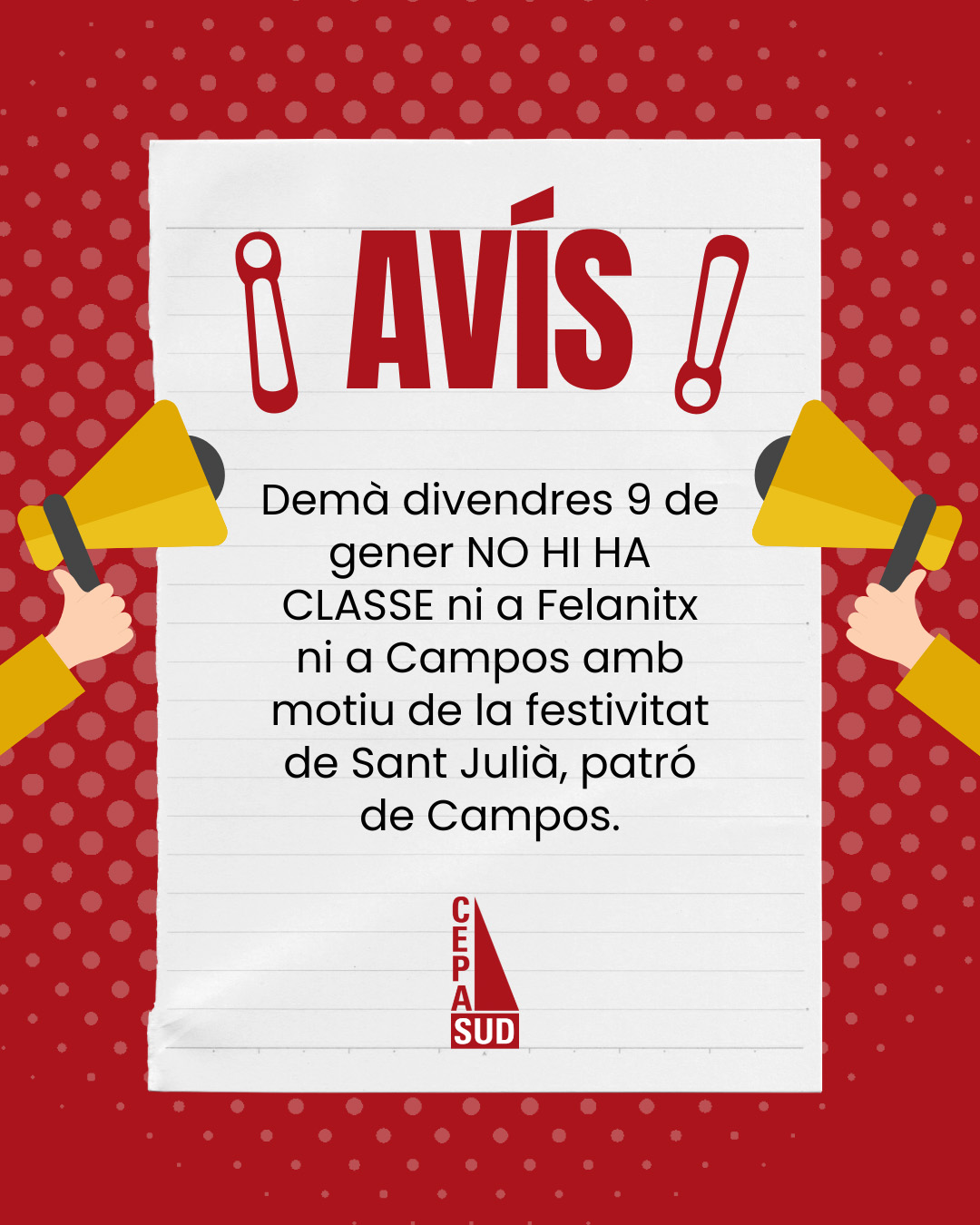 📢 Demà divendres 9 de gener NO HI HA CLASSE ni a Felanitx ni a Campos per la festivitat de Sant Julià, patró de Campos.