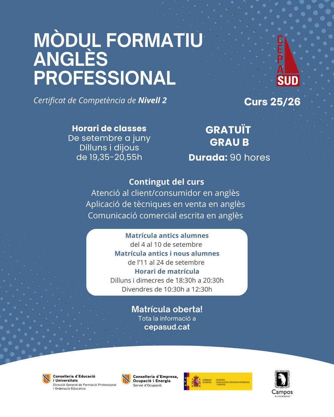 💬 Vols dominar l’anglès del teu sector? Forma’t amb el mòdul gratuït d’Anglès Professional del CEPA Sud! 📅 Setembre a juny | 🕒 Dilluns i