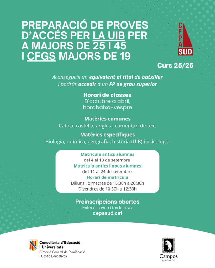 🎓 Vols accedir a la universitat o a un cicle formatiu de grau superior? Al CEPA Sud t’ajudam a preparar les proves d’accés per a majors de 25 i 45 anys (UIB) i per a majors de 19 anys (CFGS)! 💪
