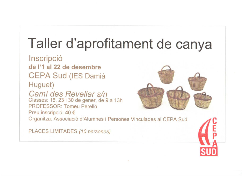 Ens feim ressò de l’activitat de l’Associació d’Alumnes i Persones Vinculades al CEPA Sud que organitza un taller d’aprofitament de canyes. Més informació a la imatge adjunta.